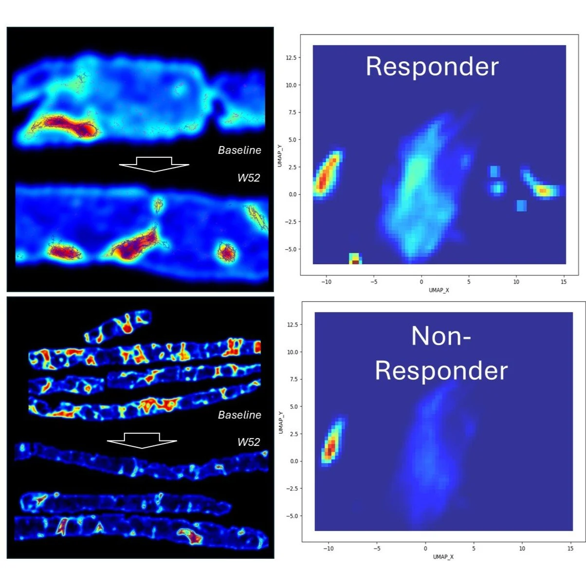 In the Phase 2b FASCINATE-2 MASH study, FibroMAP™ analyzed 246 liver biopsies using single-fiber spatial phenotyping to stratify denifanstat responders. By clustering over 300 quantitative fibrosis traits, FibroMAP™ achieved strong predictive accuracy (AUROC = 0.77–0.81), identifying unique fibrotic phenotypes linked to treatment response. This demonstrates FibroMAP’s power to uncover spatial biomarkers of therapeutic efficacy.